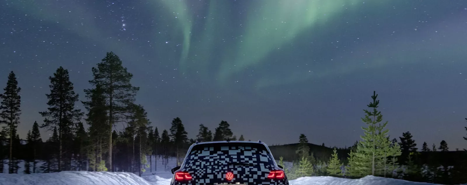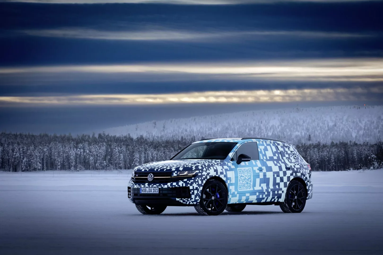 Jde nový Touareg, který nyní absolvuje své poslední zkušební kilometry ve švédském Laponsku. Stále je zamaskován folií, která obsahuje pixely QR kódu. Pokud byste náhodou na tento model narazili, QR kód načetli do mobilu, dostanete se na informační stránku věnovanou právě tomuto modelu.