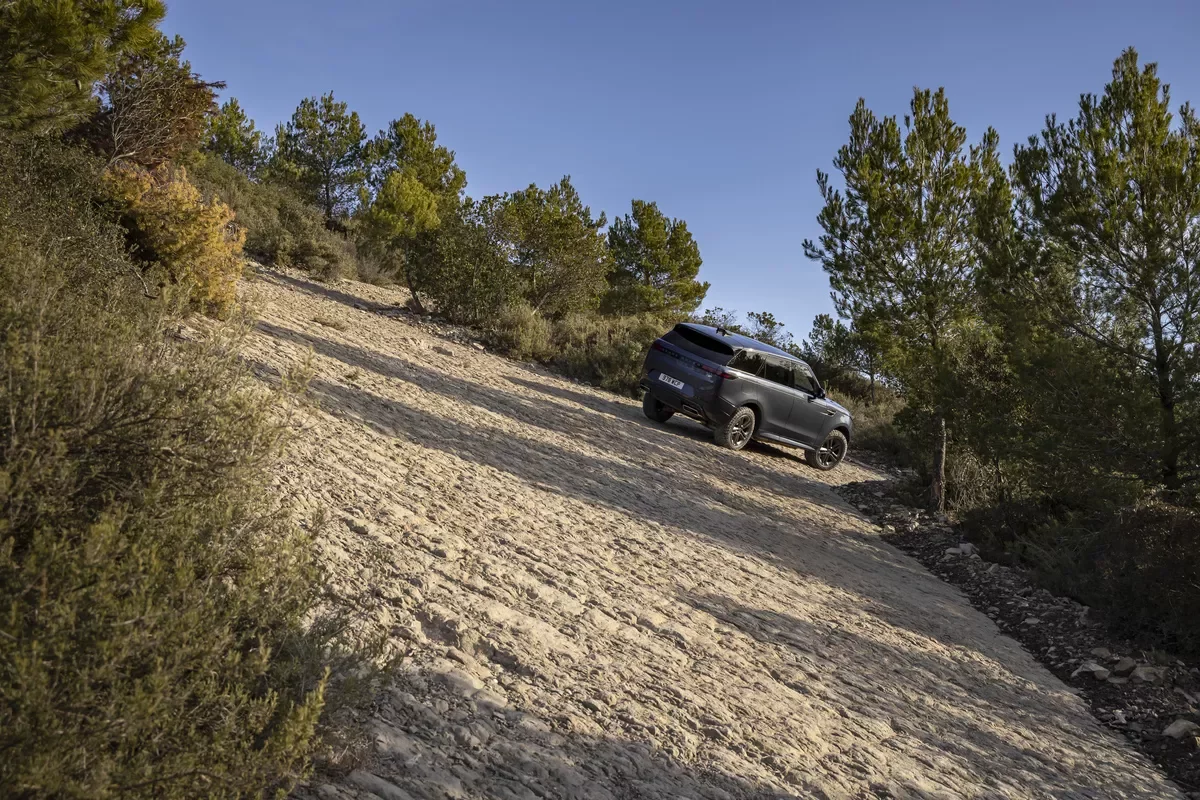 Zapínáme elektrický mód, baterka vykazuje kapacitu 93 % a vyrážíme. Ihned v úvodu nás čeká stoupání pod úhlem 30 stupňů. Výkonnost v off-roadovém prostředí zvyšuje nejnovější systém Land Rover Terrain Response 2, který chytře nastavuje nejvhodnější parametry pro daný typ terénu, a tak se nám lehce zvedá světlá výška a my stoupáme. Není to příjemný pocit skoro v autě ležet, ale auto drží „na strmé sjezdovce“ jako přibité. Potom, co dorazíme na vrchol, se před námi otvírají výhledy na pohoří Montserrat a my se kocháme a kontrolujeme stav baterie. Krpál nahoru nám sebral něco kolem 10 %. Následuje zase sešup dolů. Tady zapínáme adaptivní tempomat pro jízdu v terénu, nastavujeme max. 4 km/h, pouštíme pedál a kontrolujeme pouze naše pohyby volantem. Auto si v terénu všechno ostatní obstará. Nádhera.