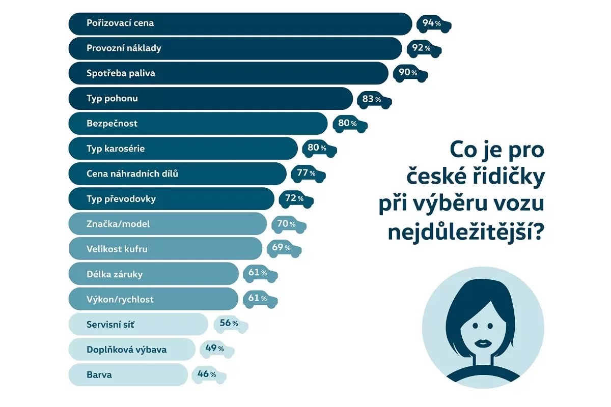Při výběru financování by se zaměřily na produkt nabízející nízkou měsíční splátku (41 %) a nízkou nebo nulovou akontaci (29 %). Pověst Češek jakožto cenově orientovaných zákaznic pak potvrzuje i žebříček nejdůležitějších faktorů rozhodujících o výběru konkrétního vozu, kterému kraluje cena (94 %), provozní náklady (92 %) a spotřeba paliva (90 %). Nejméně řidičkám naopak záleží na barvě (46 %), doplňkové výbavě v podobě jízdních asistentů nebo vyhřívání sedadel (49 %) a šíři servisní sítě (56 %).