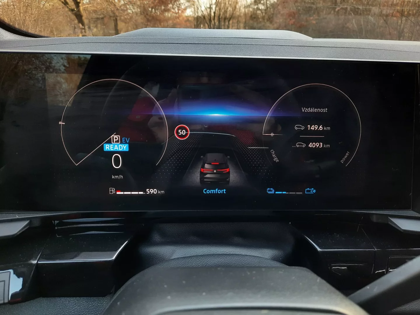 Uvnitř pak snad neexistuje nic, co by mě nebavilo. Dva na sebe navazující displeje, hlavní před řidičem posazený horizontálně, a na to uprostřed dotykový, usazený vertikálně. Oba mají grafické zpracování a překvapila mě i jejich rychlost odezvy, která se velmi zlepšila. Nechybí ani head-up displej, který sice funguje dobře, ale pro mě by zde být nemusel.