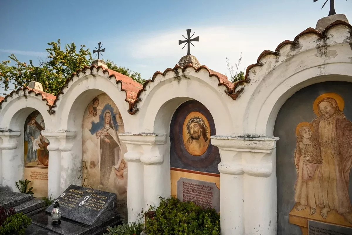 Druhou unikátní památkou je vesnický hřbitov, který se rozprostírá kolem kostela. Zdi hřbitova zdobí jednotně řešené kapličky s lidovými malbami a veršovanými náhrobními nápisy. Původcem této myšlenky byl farář Vít Cíza, během jehož působení (1819 – 1854) byly postaveny téměř všechny kapličky. Farář Vít Cíza je také autorem všech nápisů na pomnících, kromě posledních tří, které vznikly až po jeho působení.