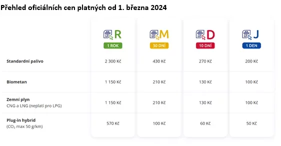 Vládní nařízení určuje pevné ceny za dálniční známky, kde roční známka nyní stojí 1 500 Kč, měsíční 440 Kč a desetidenní 310 Kč. Od 1. března dojde ke změně, kdy roční poplatek za dálniční známku vzroste na 2 300 Kč, měsíční bude stát 430 Kč, desetidenní 270 Kč a nově zavedená jednodenní známka 200 Kč. Na oficiálním webu možné zakoupit všechny typy dálničních známek s možností třicetidenního předstihu.