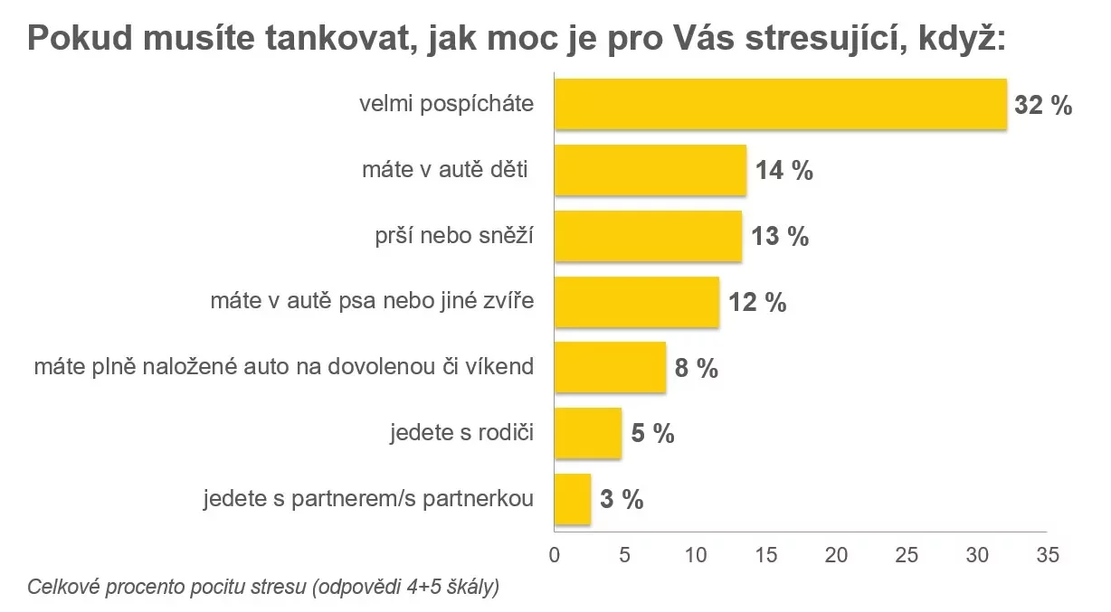 Jde o čas, ať už se na otázku spěchu díváme jakkoli. Společnost Shell Czech Republic a.s. dlouhodobě uzpůsobuje nabídku svých služeb aktuálním potřebám řidičů. Nedávno provedený průzkum mezi českými řidiči spojený se zvyklostmi při tankování ukázal, že pro třetinu řidičů je největším stresujícím faktorem spěch, a to především pro mladší generaci. 14 % řidičů pak nerado tankuje, pokud veze v autě děti. 58 % z nich obecně nerado nechává po natankování auto s dětmi bez dozoru.