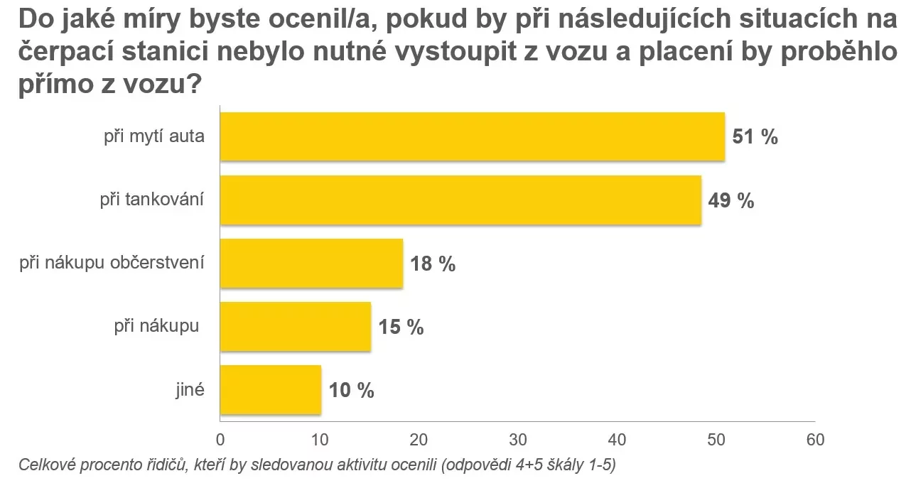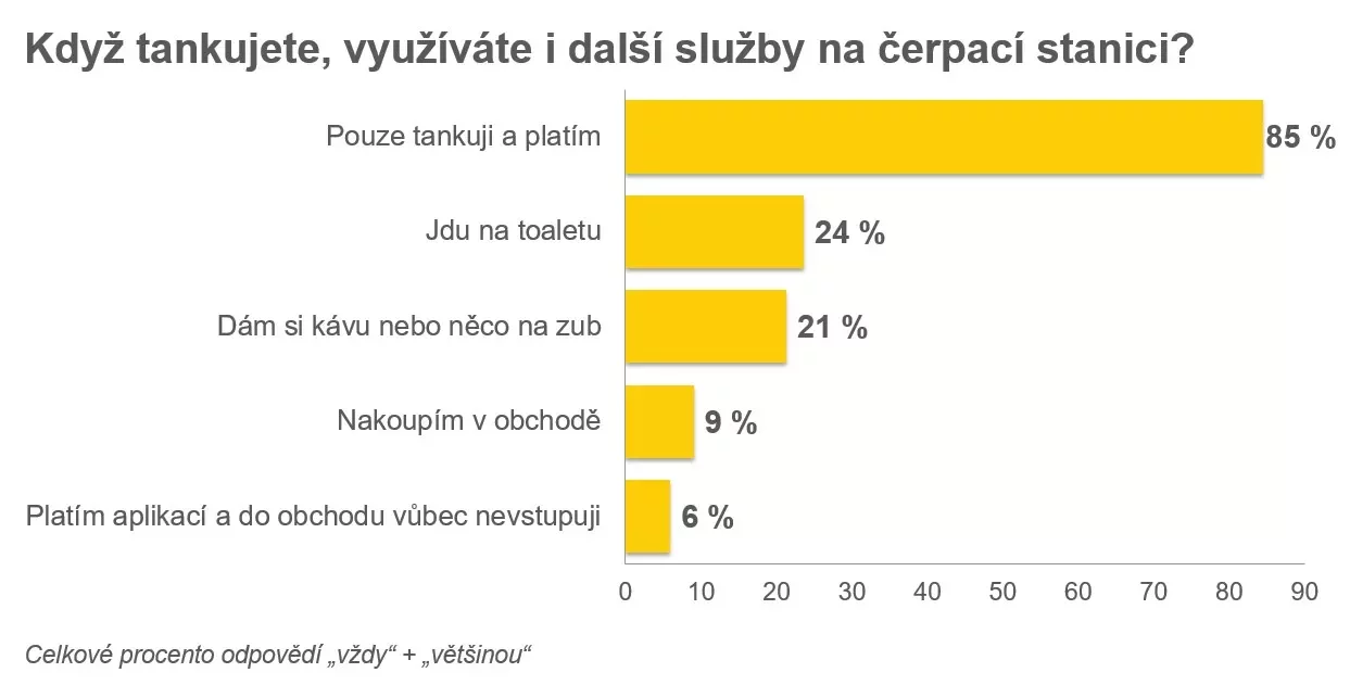 Oproti tomu 24 % řidičů si zároveň s tankováním odskočí na toaletu, 21 % si zase koupí kávu či něco dobrého na zub a skoro 10 % si pak stihne nakoupit v obchodě na stanici. Dle průzkumu ženy řidičky a muži řidiči si tyto doplňkové služby na čerpacích stanicích užívají nastejno.