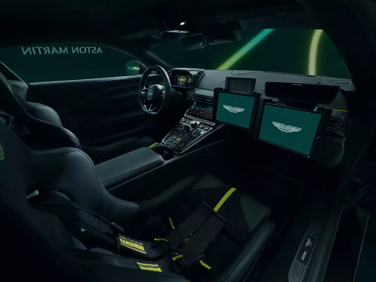 I v interiéru lze najít plno zajímavostí. Původní sedadla byla vyměněna za závodní sedačky. Speciálně navržená středová konzole pak obsahuje ovladače pro systémy FIA, obrazovky zobrazující živé časy kol, umístění všech vozidel na trati a zadní kameru. I přes svou funkčnost zůstává safety car opravdovým Aston Martinem, a tak byla interiéru vetknuta barva v odstínu Lime Essence, odkazující na závodní barvy značky.