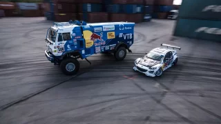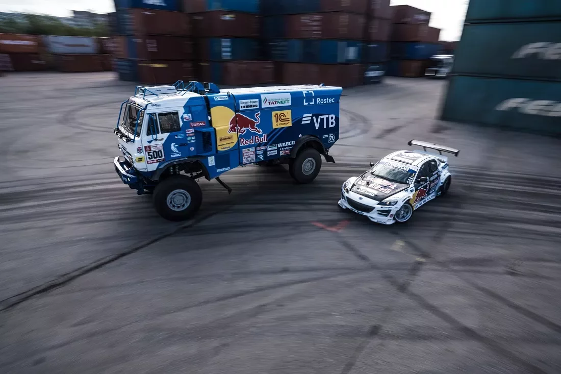 Pokud jste fanoušky driftů, tedy jízdy dveřmi napřed, pak jistě znáte jméno Mike Whiddett. Tenhle chlapík je schopen driftovat asi se vším, co se mu dostane do ruky, ale pro závody sedlá notně upravenou Mazdu RX-R. A pokud jste také fanoušky Dakaru, určitě vám nemusíme představovat Eduardy Nikolayeva, který tuto náročnou rallye ve svém Kamazu několikrát vyhrál. A jak to dopadne, když se tihle dva postaví vedle sebe a nastartují? Zhmotní se peklo!