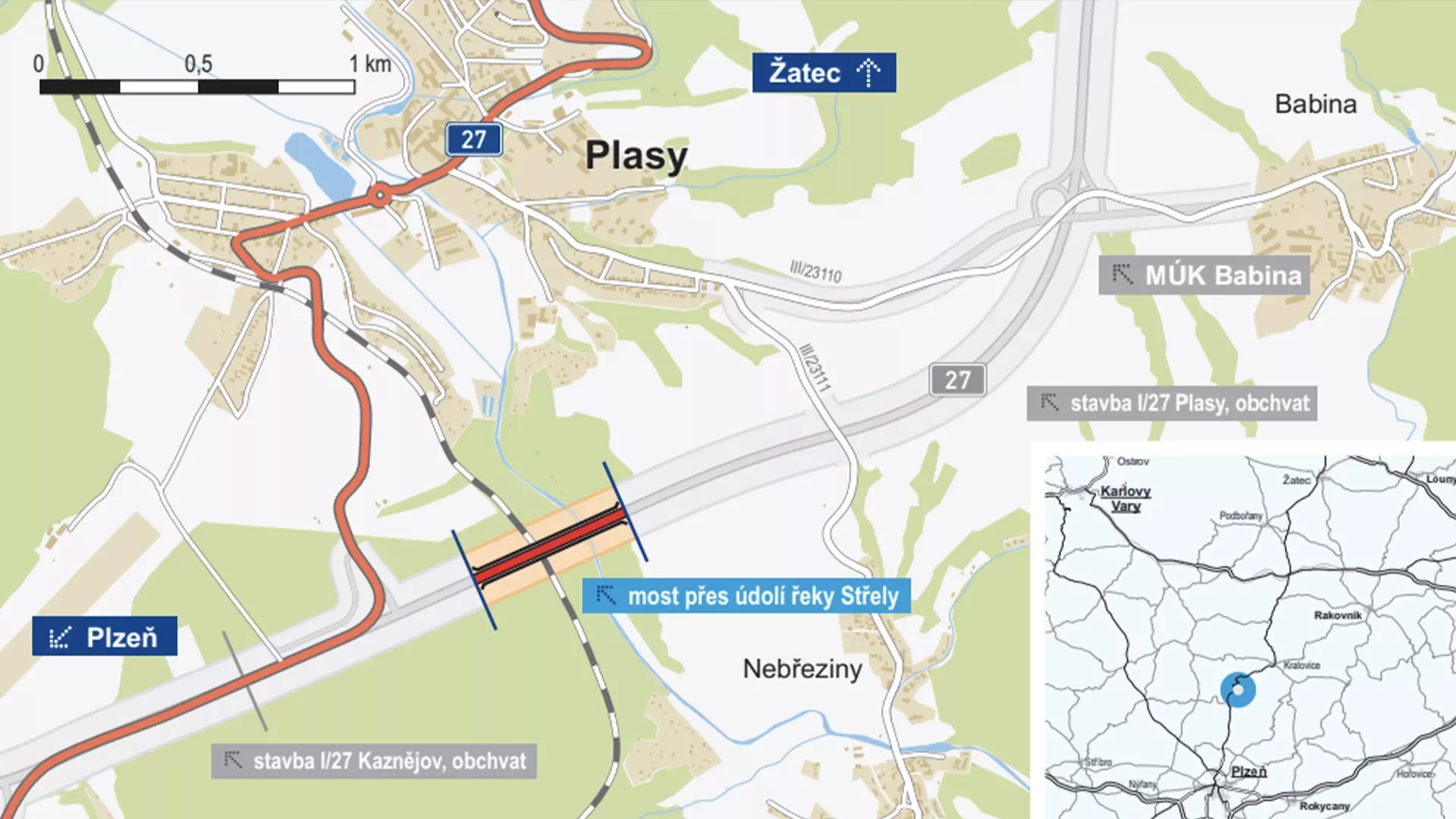 Přemostění rozsáhlého údolí řeky Střely a železniční trati č. 160 spojující Plzeň a Žatec společným mostem, jehož celková délka je 495,8 metrů, je nejnáročnějším objektem stavby na obchvatu Plas. Most v km 1,11 je široký 12,6 m a v nejvyšším místě dosahuje výšky 87,3 m. S ohledem na vedení převáděné komunikace a charakter území pod mostem je pro překročení hlavní části údolí s řekou Střelou navržena oblouková konstrukce. Oblouk bude mít rozpětí 180 m.