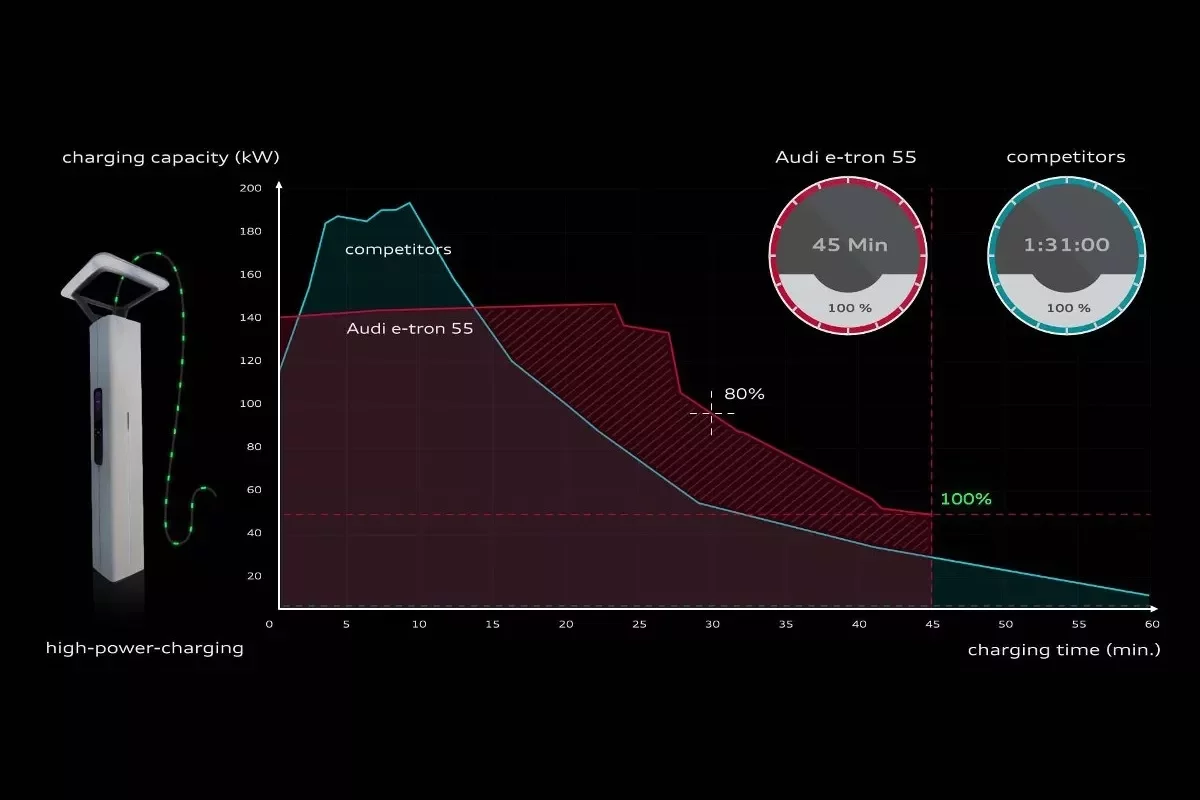 Hranice 80 % dosáhne Audi e-tron 55 po cca 30 minutách. Přestože trvá nabití zbývajících 20 % kapacity lithium-iontových akumulátorů výrazně delší dobu, zabere kompletní nabití (z 5 na 100 % kapacity) ze stojanu HPC přibližně 45 minut, což je v porovnání s konkurencí výjimečné.