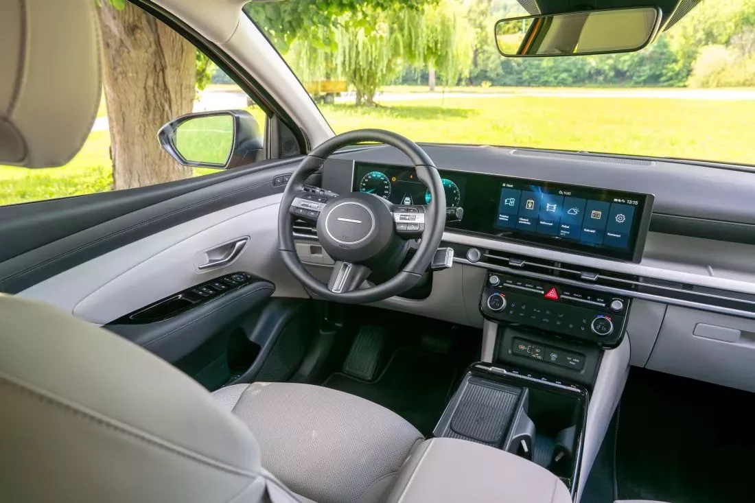 Kabině dominuje architektura s dvojicí propojených displejů. Dnes je to trend, který každý kopíruje, nicméně kabina Tucsonu patří mezi ty povedenější. Navíc ještě v bílé kůži to na vás dýchne prémiovým pocitem.