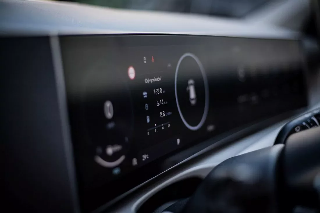 Design je opravu čistý až minimalistický, grafika krásná, rozlišení kvalitní, navíc jsou displeje celé hezky zasazené do palubní desky, jako by levitovaly v prostoru.