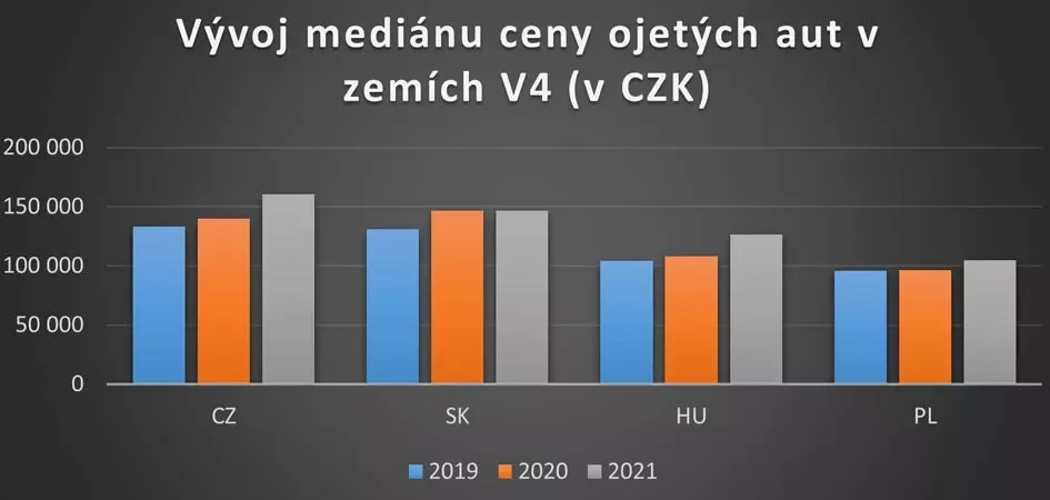 V České republice se střední hodnota ceny inzerovaných ojetin meziročně zvýšila o 14,4 % na současných 159 999 korun. V Polsku je nárůst 8,9 % na 19 500 PLN (104 751 Kč), v Maďarsku se ojeté vozy nejčastěji prodávaly za 1 850 000 HUF (126 130 Kč), tedy o 17,1 % dráž než před rokem. Pouze na Slovensku zůstal cenový medián na stejné úrovni jako v roce 2020, tedy 5 990 EUR (146 156 Kč). Vyplývá to z analýzy trhu ojetých vozů, kterou pravidelně zpracovává společnost Aures Holdings, provozovatel sítě autocenter AAA Auto a Mototechna.