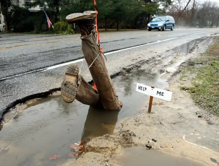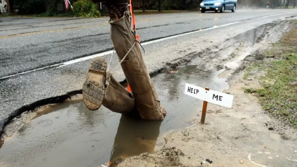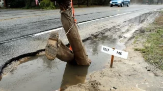 Díry v silnici jsou zrádné. Obzvláště za deště, kdy se skutečná hloubka výtluku zcela skryje pod závojem kalné vody. Jen těžko se pak odhaduje, zda se jedná jen o drobný výmol, nebo díru táhnoucí se až do středu zeměkoule. A zrovna jednu takovou díru na půli cesty do pekla se podařilo natočit na video.