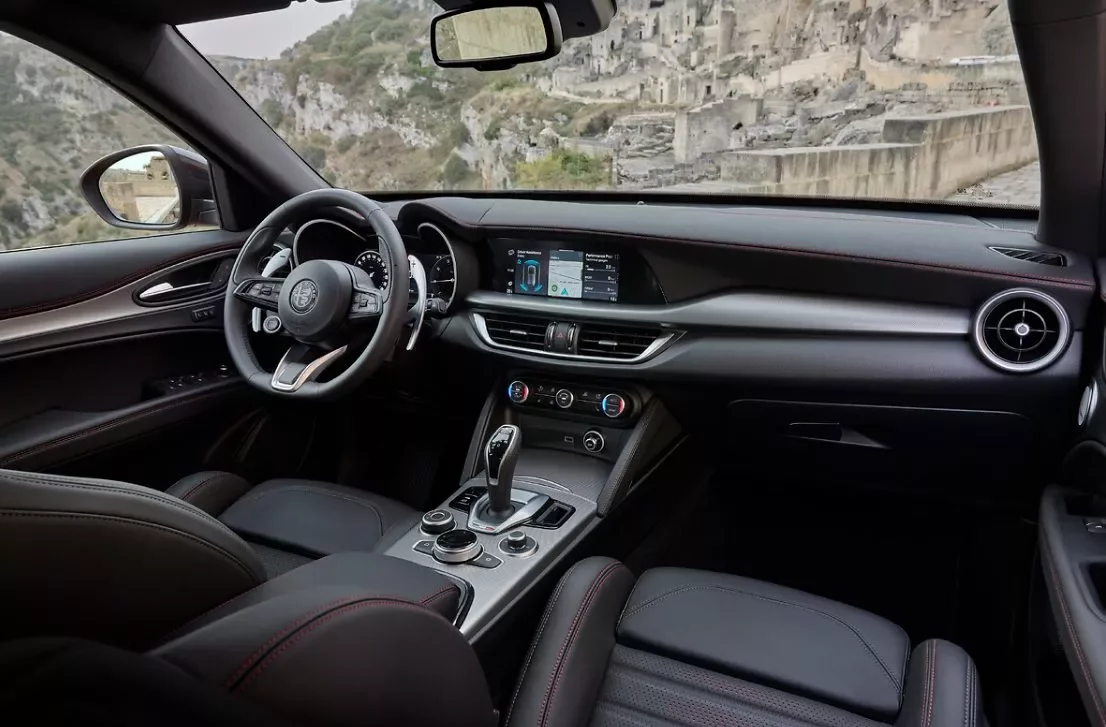 Interiér této edice je rovněž upraven a zahrnuje perforovaná kožená sedadla s červenými akcenty a vyšitým logem edice na opěrkách hlavy. K dalším prvkům patří červené švy na palubní desce, sedadlech a dveřních panelech, což vytváří harmonii mezi luxusem a sportovním duchem. Model Tonale má navíc palubní desku s karbonem, ambientní osvětlení a hliníkové nástupní prahy.